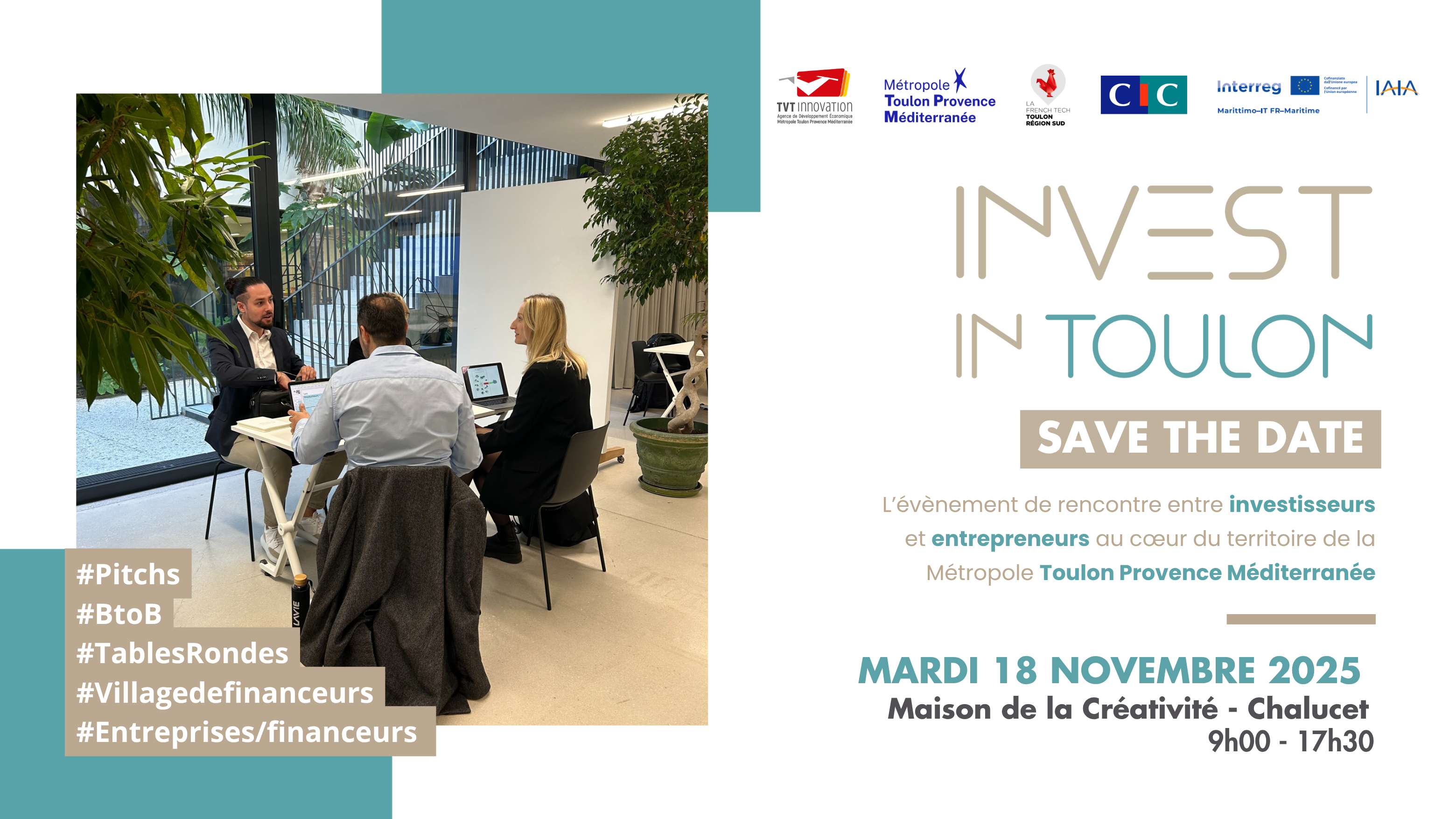 Invest in Toulon revient pour une nouvelle édition le mardi 18 novembre 202 à Chalucet dans la Maison de la Créativité de 9h00 à 17h00. Rejoignez-nous pour l'événement incontournable de l'innovation et de l'investissement sur le territoire de la Métropole Toulon Provence Méditerranée !