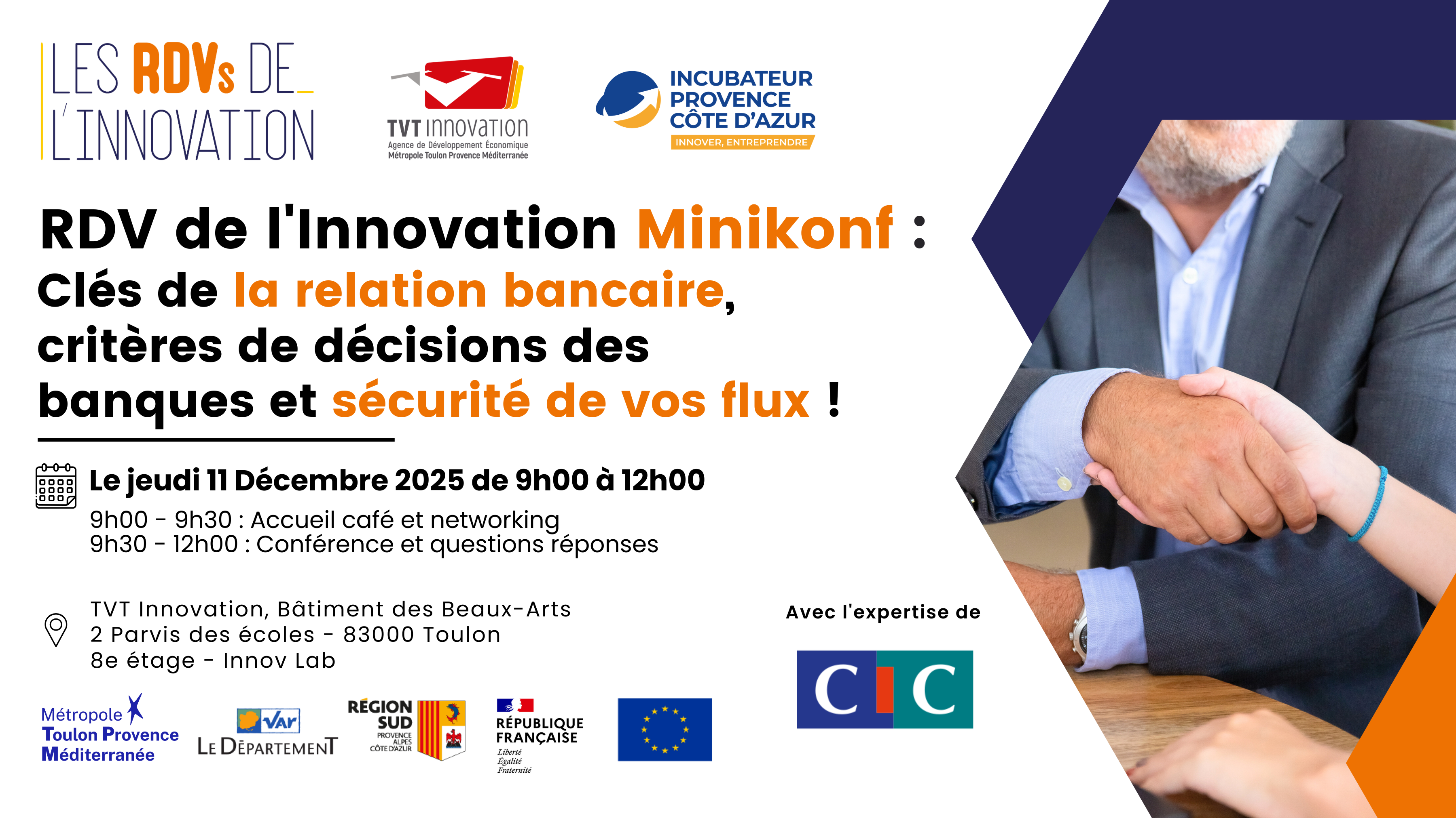 TVT Innovation, en partenariat avec l'Incubateur Provence-CÎte d'Azur, a le plaisir de vous convier à une mini-conférence sur le thÚme :  « Clés de la relation bancaire, critÚres de décisions des banques et sécurité de vos flux ! » avec l'intervention de Yann Gozlan et Jean-Philippe NONES - CIC Lyonnaise de Banque